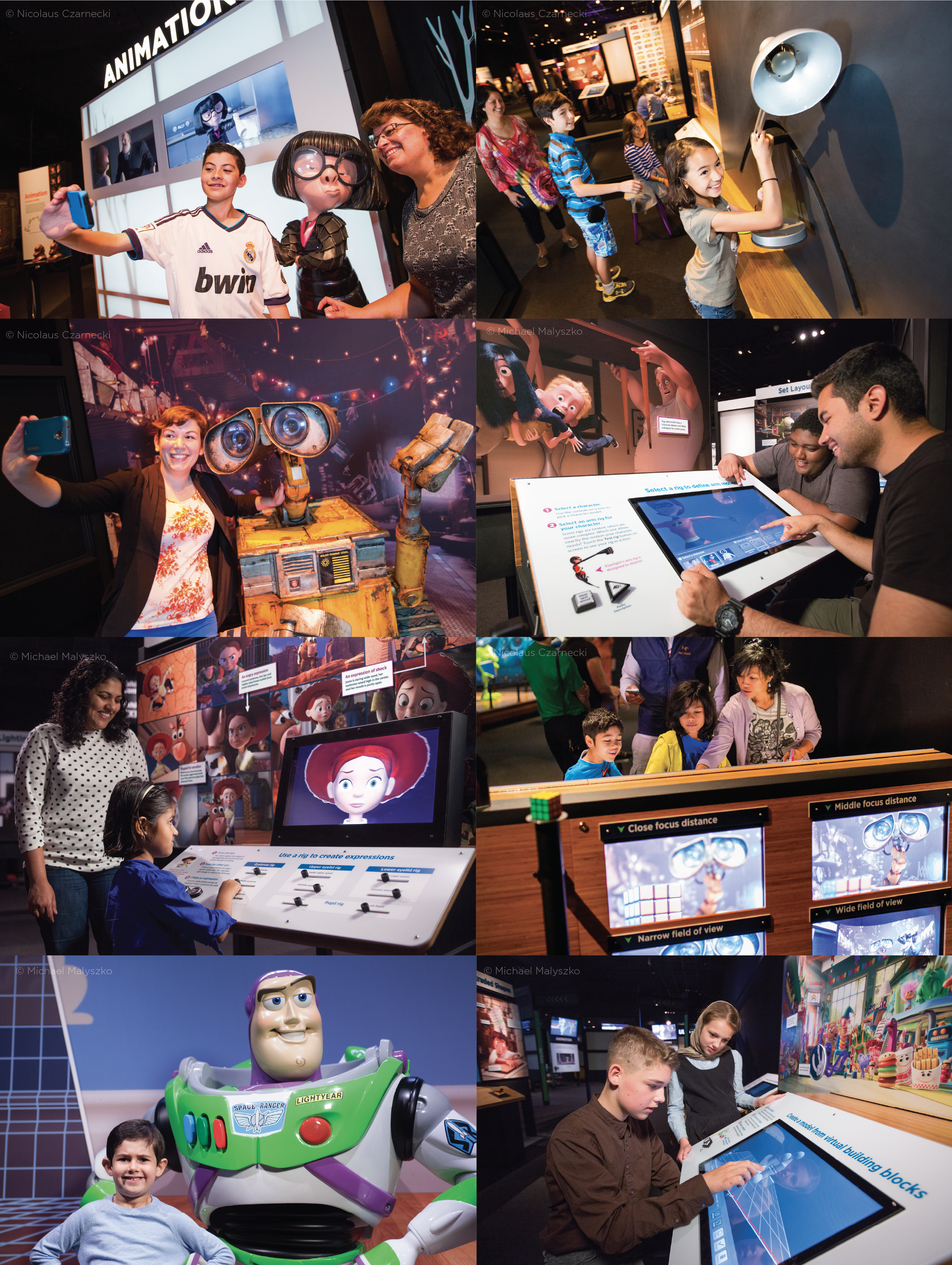 With more than 50 interactive elements, the exhibition’s eight sections each focus on a step in the filmmaking process to give you an unparalleled view of the production pipeline and concepts used at Pixar every day. Participate in fun, engaging hands-on activities, listen to firsthand accounts from members of the studios’ production teams, and even come face-to-face with re-creations of your favorite Pixar film characters, including Buzz Lightyear, Dory, Mike and Sulley, Edna Mode, and WALL•E!